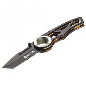 Aço inoxidável 420,Lâmina com 3mm de espessura,Cabo de 12cm em alumínio,Design anatômico,Lâmina Tanto de 7,3cm,Clip de fixação,Acabamento em lâmina preta e cabo em alumínio em preto com detalhes alaranjados.Dimensões:19,03cm,Comprimento da Lâmina:7,03cm,.Peso: 132g.